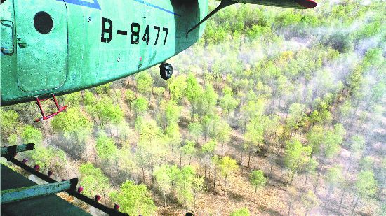 4月14日,一架農(nóng)用飛機(jī)在第一師10團(tuán)防風(fēng)林帶上空噴灑殺蟲劑。自4月上旬以來,兵團(tuán)對葉爾羌河、塔里木河流域的第一師、第二師和第三師的35萬畝野生胡楊林和人工林實施飛防,有效控制食葉害蟲對野生胡楊林和人工林的危害。王志清 攝