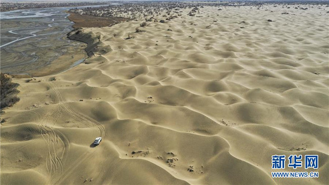 依明乘坐的汽車行駛在塔克拉瑪干沙漠中。從依明家坐車前往于田縣城,全程不足300公里,越野車需行駛7小時左右(3月19日無人機拍攝)。新華社記者 胡虎虎 攝