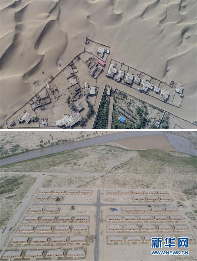拼版照片:上圖為地處沙漠腹地的新疆于田縣達(dá)里雅布依鄉(xiāng)一處村落(2018年9月6日無人機拍攝);下圖為建設(shè)中的達(dá)里雅布依小鎮(zhèn)易地扶貧安置點(2018年9月8日無人機拍攝)。新華社記者 胡虎虎 攝