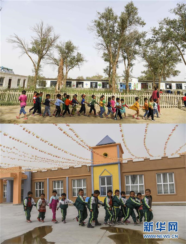 拼版照片:上圖為新疆于田縣達(dá)里雅布依鄉(xiāng)小學(xué)的學(xué)生走在校園里(2018年9月5日攝);下圖為學(xué)生們在達(dá)里雅布依小鎮(zhèn)易地扶貧安置點的新校舍前(2019年3月20日攝)。新華社記者 胡虎虎 攝