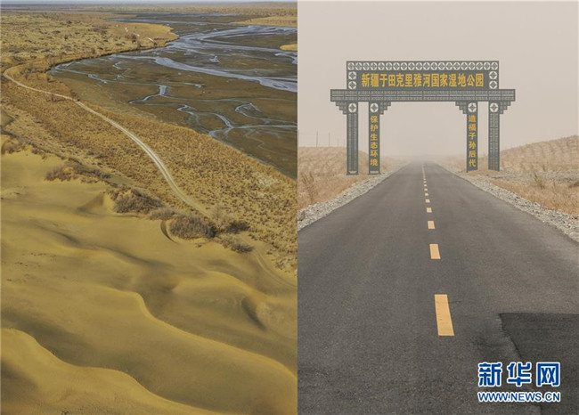 拼版照片:左圖為沿著克里雅河通向地處沙漠深處新疆于田縣達(dá)里雅布依鄉(xiāng)的路(3月19日無人機拍攝);右圖為從縣城通往達(dá)里雅布依小鎮(zhèn)易地扶貧安置點的柏油路(3月20日攝)。新華社記者 胡虎虎 攝
