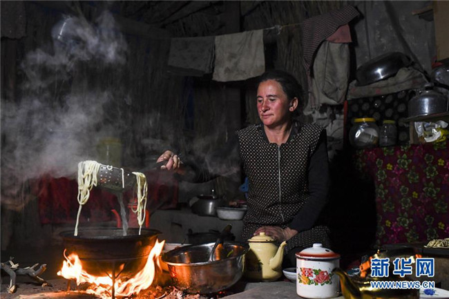 在地處塔克拉瑪干沙漠腹地的于田縣達(dá)里雅布依鄉(xiāng)5小隊,依明的妻子在夜間做拌面(3月16日攝)。新華社記者 胡虎虎 攝