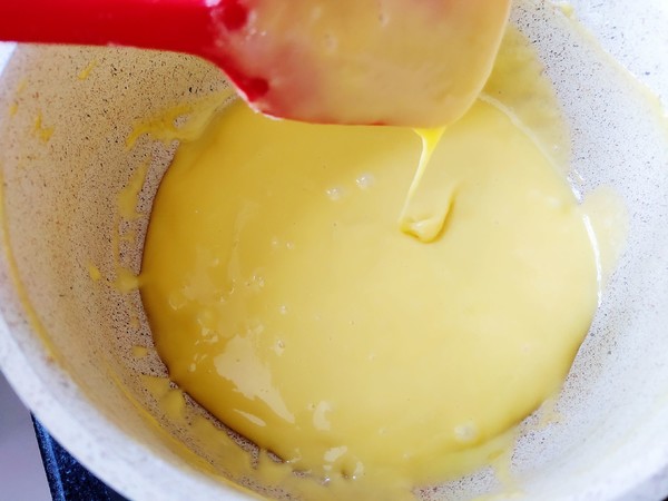 2.今天用燙面后蛋法:把牛奶,玉米油和10克細(xì)砂糖入鍋加熱至糖融化。