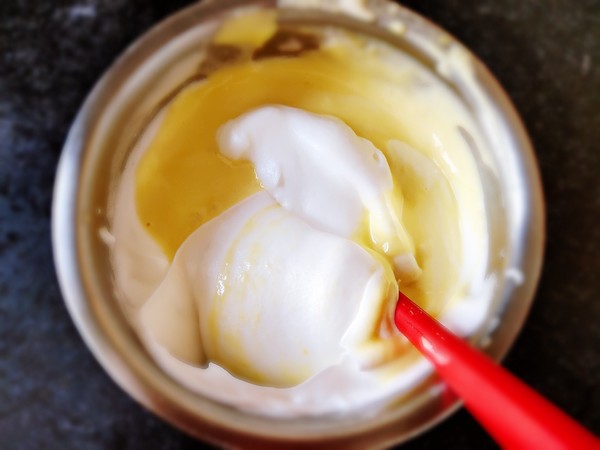 8.拌勻后,倒回蛋白霜之內(nèi),繼續(xù)上下翻拌均勻。