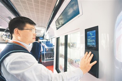 2019中國(guó)(上海)國(guó)際技術(shù)進(jìn)出口交易會(huì)上,工作人員在智能熊貓巴士上演示利用掌脈進(jìn)行購(gòu)物。龍巍 攝(人民視覺(jué))