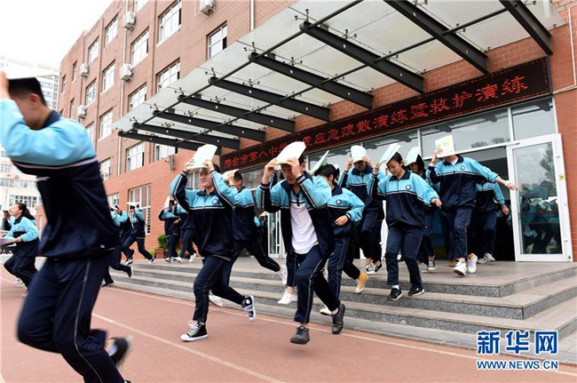 5月12日,邢臺(tái)市第八中學(xué)學(xué)生在進(jìn)行模擬緊急疏散演練。新華社記者 朱旭東 攝