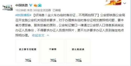 據(jù)中國鐵路總公司官方微博消息,公安部鐵路公安局召開全路公安機(jī)關(guān)視頻會要求,對于辦理乘車臨時身份證明交費(fèi)照相問題,要本著方便旅客、服務(wù)旅客的原則,公安制證窗口一律通過公安部人口信息系統(tǒng)核實(shí)辦證人員身份,不得要求辦證人員提供照片,更不允許要求辦證人員到指定地點(diǎn)照相辦理。