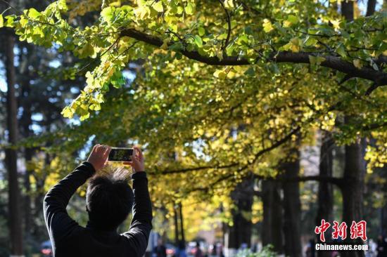 大學校園內(nèi)銀杏樹葉變黃,吸引民眾前來拍照游覽。中新社記者 任東 攝
