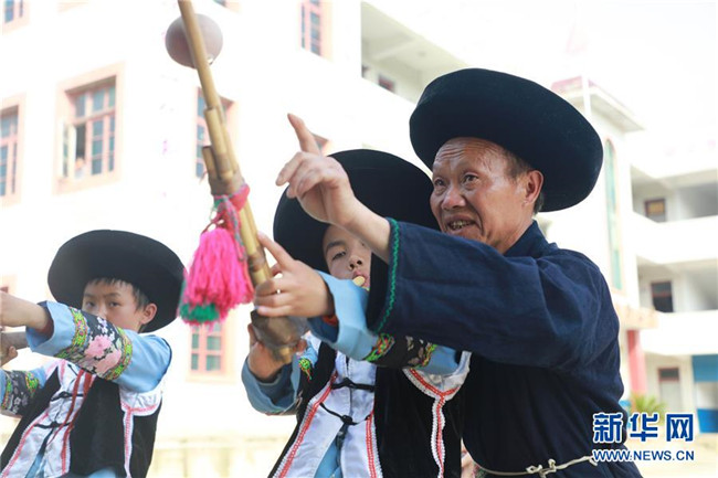 5月14日,在畢節(jié)市黔西縣協(xié)和鎮(zhèn)立新村立新小學(xué),老師在指導(dǎo)學(xué)生學(xué)習(xí)蘆笙。新華社發(fā)(周訓(xùn)超 攝)