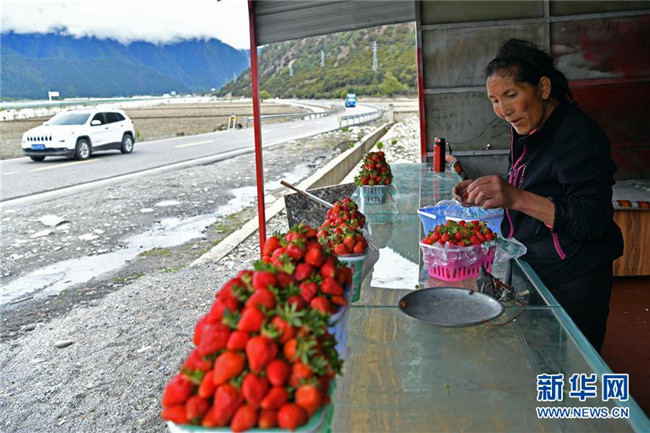 5月14日,久巴村村民扎西拉姆在川藏公路旁的草莓零售店擺放草莓。 新華社記者 李鑫 攝
