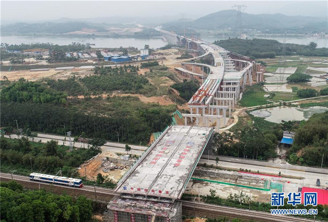 4月2日,由廣東省交通集團投資建設、中鐵四局承建的汕(頭)湛(江)高速公路北江特大橋跨京廣鐵路、國道G240轉體橋成功轉體,這是轉體橋轉體后的位置(無人機拍攝)。 新華社記者 劉大偉 攝