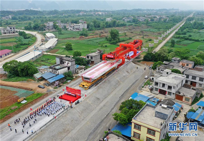 在廣西都安瑤族自治縣貴南高鐵澄江雙線特大橋施工現(xiàn)場,工人在架設大橋首榀箱梁(4月29日無人機拍攝)。 新華社記者 陸波岸 攝