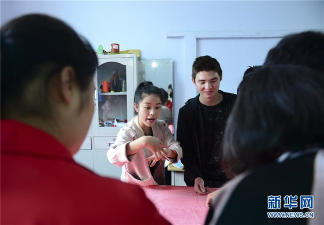 5月15日,在畢節(jié)市特殊教育學(xué)校,老師在用手語指導(dǎo)學(xué)生縫制床單。 新華社發(fā)(尚宇杰 攝)
