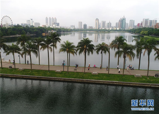 5月15日,市民在廣西南寧市南湖公園休閑觀光(無(wú)人機(jī)拍攝)。