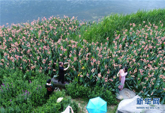 5月15日,市民在廣西南寧市南湖沿岸留影(無(wú)人機(jī)拍攝)。