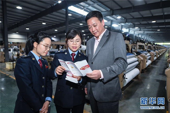 浙江省長興縣稅務部門工作人員在一家公司的車間內(nèi)向企業(yè)負責人宣傳減稅降費政策(4月16日攝)。新華社記者 徐昱 攝
