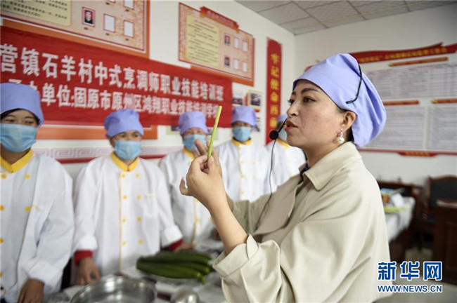 培訓老師在中式烹調(diào)師職業(yè)技能培訓班上為寧夏固原市原州區(qū)頭營鎮(zhèn)石羊村婦女講解食材選用規(guī)范(5月14日攝)。 新華社發(fā)(馮開華 攝)