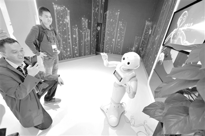 5月26日,參觀者在2019中國國際大數(shù)據(jù)產(chǎn)業(yè)博覽會上與5G+智能機(jī)器人進(jìn)行拍照互動(dòng)。記者 楊文斌 攝