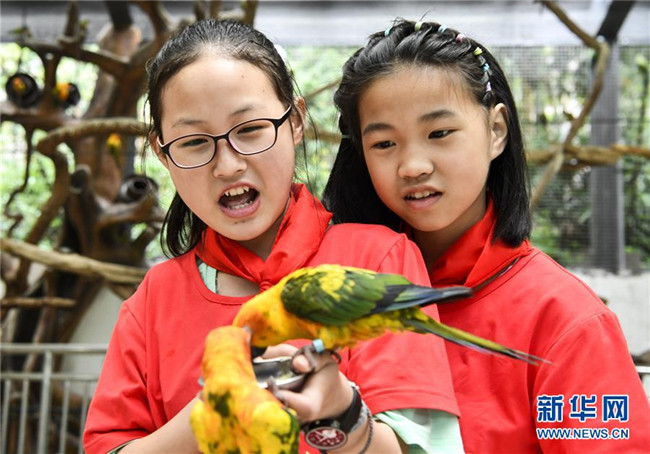 5月29日,在重慶市動物園內(nèi)的互動區(qū),蓼子鄉(xiāng)第一中心小學(xué)的學(xué)生們給鸚鵡喂食。新華社記者 劉潺 攝