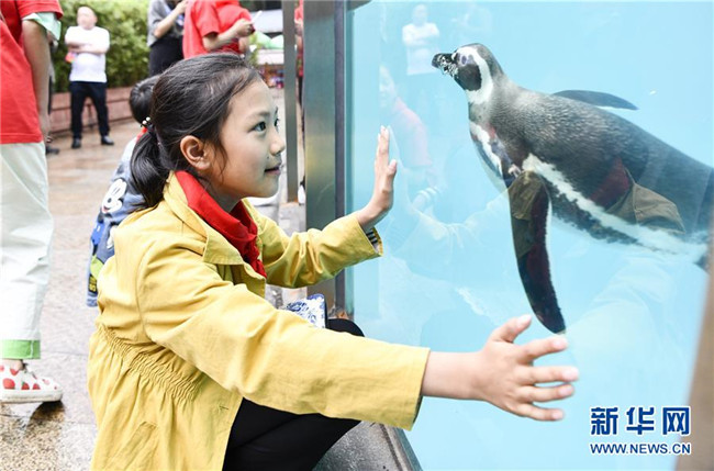 5月29日,在重慶市動物園內(nèi)的互動區(qū),蓼子鄉(xiāng)第一中心小學(xué)的馬嬌陽在觀賞企鵝。新華社記者 劉潺 攝