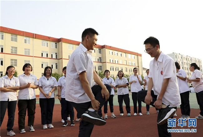 6月2日,在山東省濱州市博興縣第三中學(xué),高三學(xué)生在操場上做游戲放松心情。新華社發(fā)(陳彬 攝)