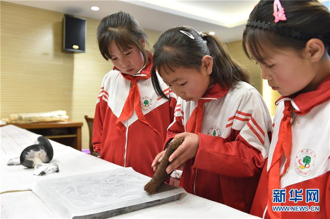 5月31日,學生們在寧夏固原博物館體驗拓印。新華社記者 唐亞蒙 攝