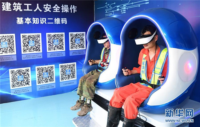 6月5日,重慶化龍橋超高層項(xiàng)目工人在VR安全體驗(yàn)館內(nèi)體驗(yàn)“高空墜落”。在VR安全體驗(yàn)館,工人們通過VR游戲的方式了解施工過程中可能遇到的危險(xiǎn)、困難以及解決方法。 新華社記者 王全超 攝