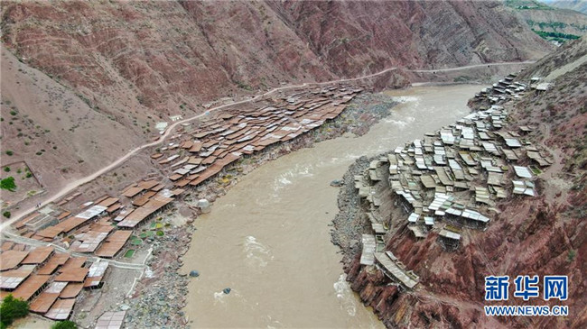 西藏芒康縣納西民族鄉(xiāng)加達(dá)村村民在鹽田曬鹽(6月4日攝)。新華社記者晉美多吉攝