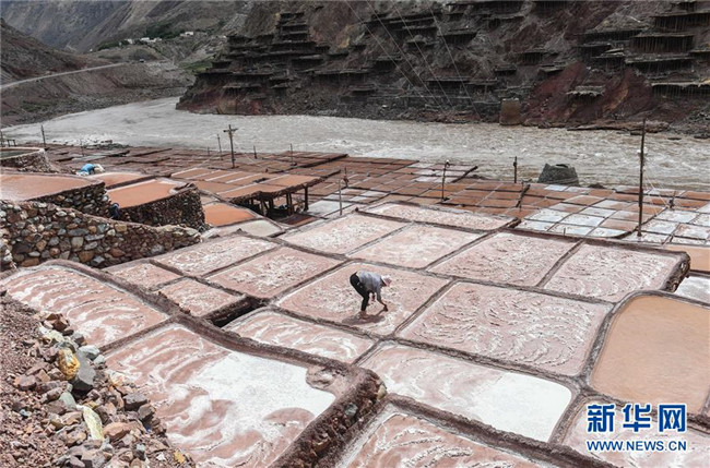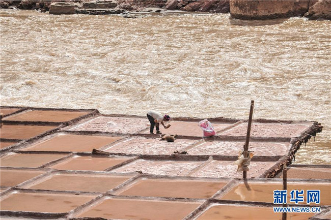 西藏芒康縣納西民族鄉(xiāng)加達(dá)村一名村民在收集鹽田曬的鹽(6月4日攝)。新華社記者晉美多吉攝