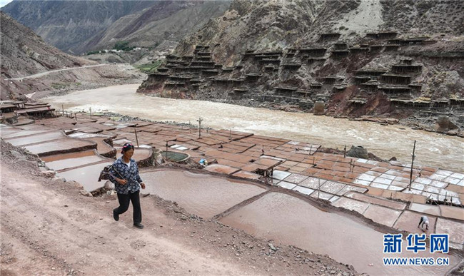 西藏芒康縣納西民族鄉(xiāng)加達(dá)村一名村民走過鹽田(6月4日攝)。新華社記者晉美多吉攝
