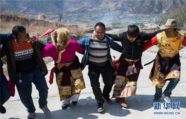 在云南香格里拉市五境鄉(xiāng),“精準(zhǔn)扶貧感恩連”隊員在跳鍋莊(3月13日攝)。新華社記者 胡超 攝