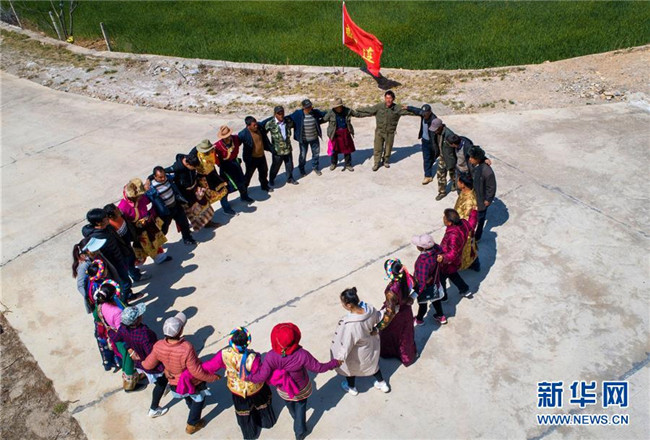 在云南香格里拉市五境鄉(xiāng),“精準(zhǔn)扶貧感恩連”隊員在跳鍋莊(3月13日無人機(jī)拍攝)。新華社記者 胡超 攝