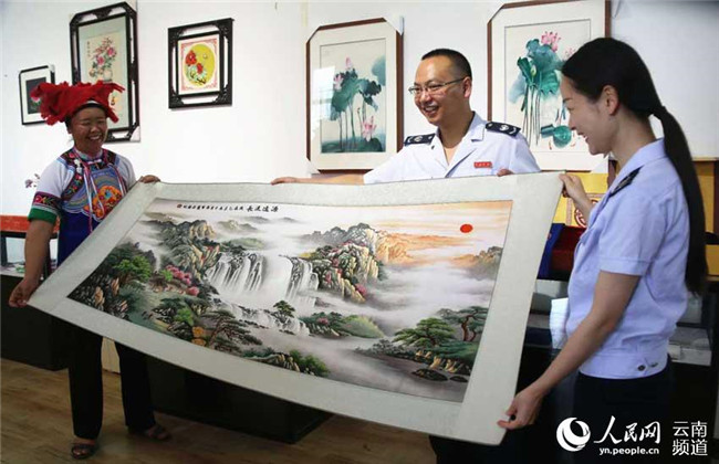 沉下心來學習刺繡的王陸芬朝著自己的小目標努力。白天,她向村里的老人們學習刺繡技法,學習構(gòu)圖、畫圖,晚上就在家里刻苦練習。一有機會,王陸芬就出去考察學習。“有一年去上海考察,看到他們的刺繡還沒有我做的精細,沒想到價格還很貴。”這讓王陸芬堅定了自己的想法,在王陸芬的帶動下,白沙坡村成立了刺繡協(xié)會,協(xié)會一開始只有26人。2014年2月,技藝日臻成熟的王陸芬成立了“紙藝刺繡農(nóng)民專業(yè)合作社”,2015年成立硯山縣華韻手工刺繡有限公司。