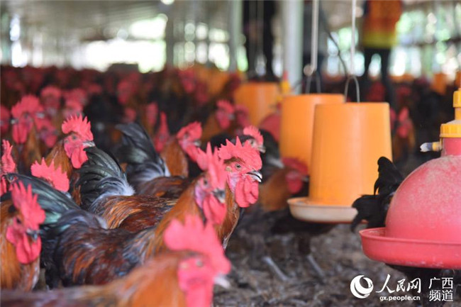 潞城瑤族鄉(xiāng)豐防村黨支部書記梁少生對養(yǎng)殖雞進(jìn)行悉心管護(hù)