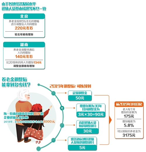 比如,北京市人力資源和社會保障局發(fā)布的調(diào)整方案顯示,養(yǎng)老金按照5%左右的增幅進(jìn)行調(diào)整后,人均增加220元左右,較去年略有增加;湖南省公布的退休人員養(yǎng)老金調(diào)整方案顯示,養(yǎng)老金調(diào)整后,人均月增加金額為140元左右,比2018年的月人均增加134元,調(diào)整金額略有增加;寧夏決定從2019年1月1日起調(diào)整全區(qū)企業(yè)和機(jī)關(guān)事業(yè)單位退休人員基本養(yǎng)老金,其中企業(yè)提高比例為5.5%,機(jī)關(guān)事業(yè)單位提高比例為4%,預(yù)計全區(qū)共有63.67萬人受益。