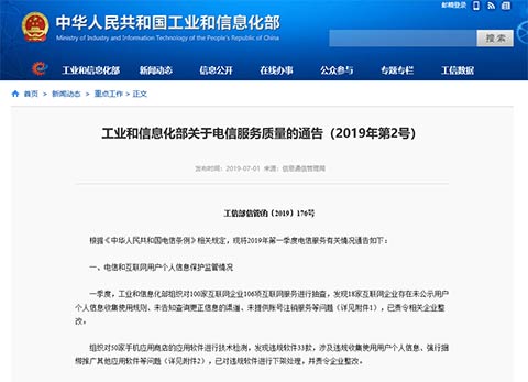 通告稱,一季度,工信部對100家互聯(lián)網企業(yè)106項互聯(lián)網服務進行抽查,發(fā)現(xiàn)18家互聯(lián)網企業(yè)存在未公示用戶個人信息收集使用規(guī)則、未告知查詢更正信息的渠道、未提供賬號注銷服務等問題,工信部已責令相關企業(yè)整改。