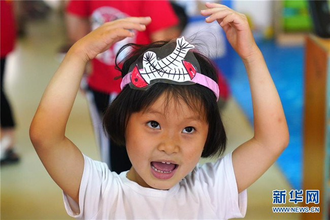 7月4日,孩子們頭戴不同種類垃圾的圖案,在游戲中交流。新華社記者 鮑菲菲 攝