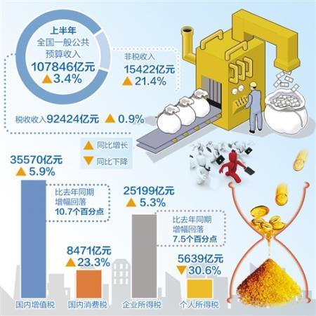 上半年,全國一般公共預(yù)算收入107846億元,同比增長(zhǎng)3.4%。其中,全國稅收收入92424億元,同比增長(zhǎng)0.9%。