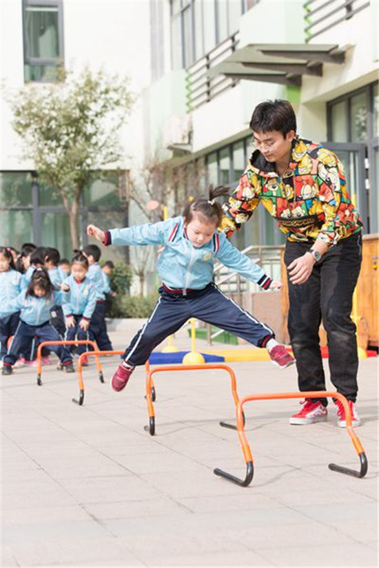 3月4日,山東省濟南市盛景家園幼兒園教師董懷遠在給該幼兒園小朋友上戶外體能課。董懷遠供圖