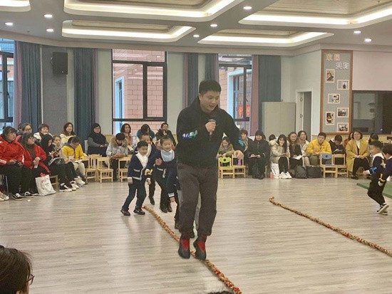 1月10日,浙江省建德市航頭中心幼兒園教師鄭文聰在進行幼兒園大班健康活動《稻繩爬爬樂》。鄭文聰供圖
