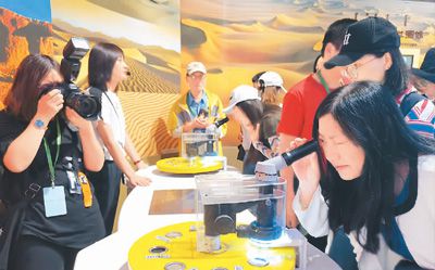在內蒙古恩格貝沙漠博物館(科學館),華文媒體代表用顯微鏡觀察沙粒。