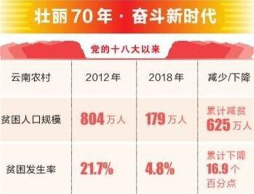 隨著精準(zhǔn)扶貧的深入推進(jìn),全省農(nóng)村貧困人口大幅減少,貧困發(fā)生率持續(xù)下降。國家統(tǒng)計局云南調(diào)查總隊發(fā)布的數(shù)據(jù)顯示:黨的十八大以來,云南農(nóng)村貧困人口規(guī)模從2012年804萬人減少到2018年179萬人,累計減貧625萬人,年均減貧104萬人;農(nóng)村貧困發(fā)生率從2012年的21.7%,持續(xù)下降到2018年的4.8%,累計下降16.9個百分點,年均下降2.8個百分點。2018年全省貧困地區(qū)農(nóng)村居民人均可支配收入9595元,是2012年的2倍,年均增長12.4%。貧困地區(qū)農(nóng)村居民收入增速持續(xù)高于全省農(nóng)村平均增速。