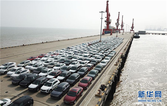 在位于上海臨港的上海南港碼頭,新出廠的汽車等待裝船轉(zhuǎn)運(6月27日無人機拍攝)。 新華社記者 方喆 攝