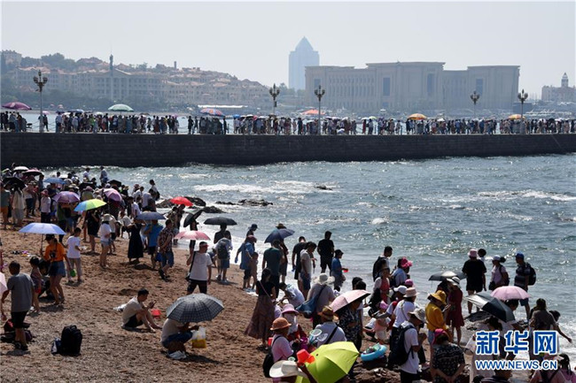 8月6日,游客在青島棧橋景區(qū)游玩。 暑期旅游旺季,海濱城市青島各景區(qū)、景點游人如織。 新華社記者 李紫恒 攝