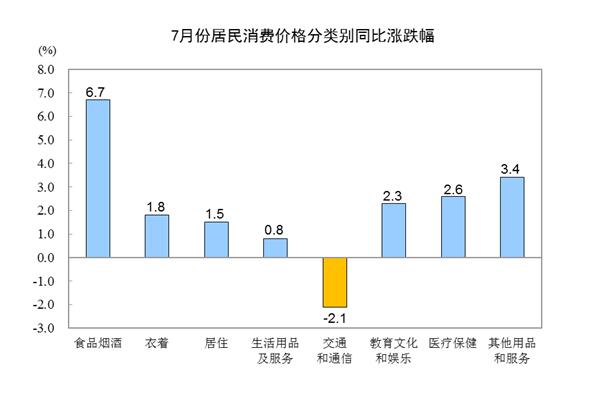 7月份,食品煙酒價格同比上漲6.7%,影響CPI(居民消費(fèi)價格指數(shù))上漲約1.95個百分點(diǎn)。其中,鮮果價格上漲39.1%,影響CPI上漲約0.63個百分點(diǎn);畜肉類價格上漲18.2%,影響CPI上漲約0.75個百分點(diǎn)(豬肉價格上漲27.0%,影響CPI上漲約0.59個百分點(diǎn));雞蛋價格上漲11.4%,影響CPI上漲約0.06個百分點(diǎn);禽肉類價格上漲7.6%,影響CPI上漲約0.09個百分點(diǎn);鮮菜價格上漲5.2%,影響CPI上漲約0.12個百分點(diǎn);糧食價格上漲0.6%,影響CPI上漲約0.01個百分點(diǎn)。
