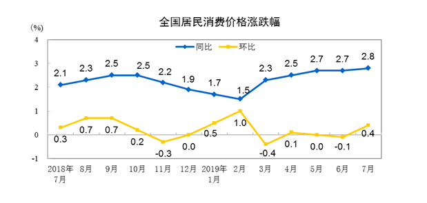 記者從國家統(tǒng)計(jì)局獲悉,2019年7月份,全國居民消費(fèi)價格同比上漲2.8%。其中,城市上漲2.7%,農(nóng)村上漲2.9%;食品價格上漲9.1%,非食品價格上漲1.3%;消費(fèi)品價格上漲3.4%,服務(wù)價格上漲1.8%。1??—7月平均,全國居民消費(fèi)價格比去年同期上漲2.3%。