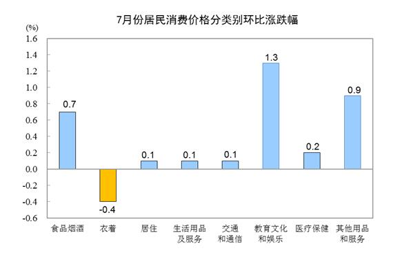 7月份,全國居民消費(fèi)價格環(huán)比上漲0.4%。其中,城市上漲0.4%,農(nóng)村上漲0.3%;食品價格上漲0.9%,非食品價格上漲0.3%;消費(fèi)品價格上漲0.2%,服務(wù)價格上漲0.7%。