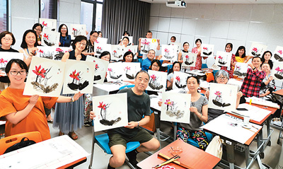 圖為教師們?cè)谡故緡?guó)畫作品。北京外國(guó)語大學(xué)供圖