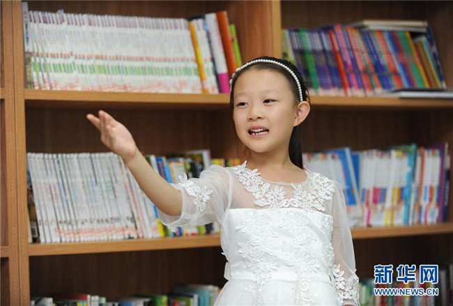 一名孩子在永清縣城區(qū)街道公益書屋內(nèi)誦讀經(jīng)典詩(shī)文(8月20日攝)。新華社記者 李曉果 攝
