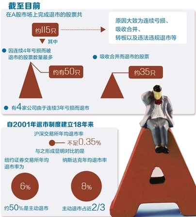 自2001年退市制度建立18年來,滬深交易所年均退市率依舊不足0.35%,主動退市更是少之又少,遠(yuǎn)不能保障A股進(jìn)出平衡。與之形成鮮明對比的是,紐約證券交易所年均退市率為6%,約50%是主動退市;納斯達(dá)克年均退市率8%,主動退市占近2/3,而A股市場則大多是被動退市,極少有主動退市的情況。